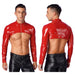 Shiny PVC grips your shoulders, throat hugged by that tight mock neck. Long sleeves, micro length—just enough coverage to make the bare chest hit harder. This isn’t a jacket; it’s a signal.