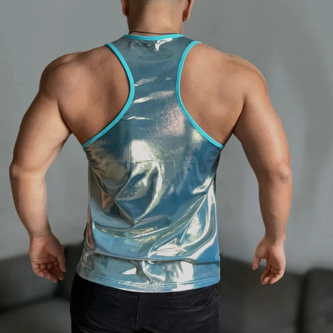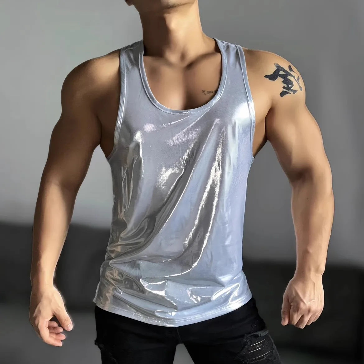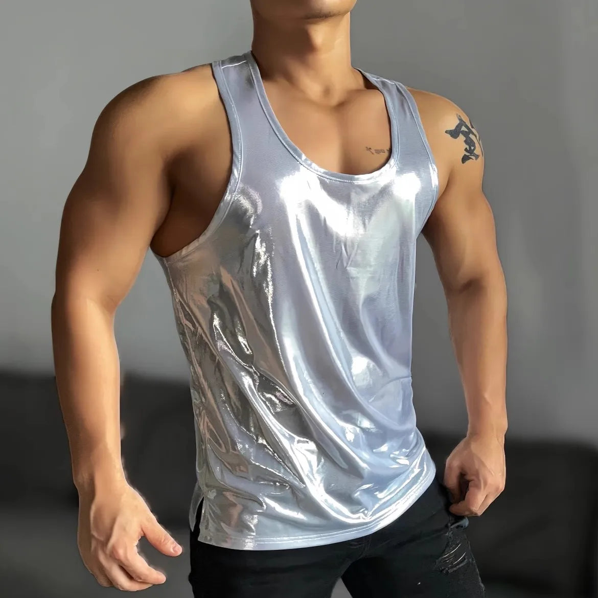 This men’s metallic tank top is built for bodies in motion. Dance floor sweat. Shoulder-to-shoulder. Hands sliding at your waist like they already know where to go. The straight hem sits clean, but the vibe isn’t.