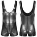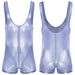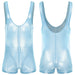 Think 90s joypad meets festival sunset. The Gameboi Holo‑Zip is cut in slick, pearlescent fabric that shifts under lights—sky‑blue one moment, chrome the next. The shape stays athletic: deep scoop, wide straps, and a secure boyshort leg that moves when you do. A full‑length front zipper lets you decide the reveal—zipped for the pic, cracked open for the afters.