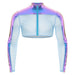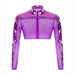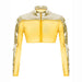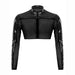 Metallic collar tight around your neck, shoulders blazing. Mesh body cropped high so abs, tattoos, and sweat sit on display. This men’s crop jacket doesn’t cover you—it frames you.