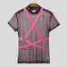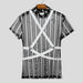 It’s a fitted mock‑neck tee in sheer striped mesh that shows just enough chest and ink while keeping your shoulders and arms defined. Across the torso, a built‑in harness of soft elastic straps crisscrosses front and back, complete with metal rings. It gives you that harness energy without extra buckles or layering; you just pull it on like a T‑shirt and you’re done.