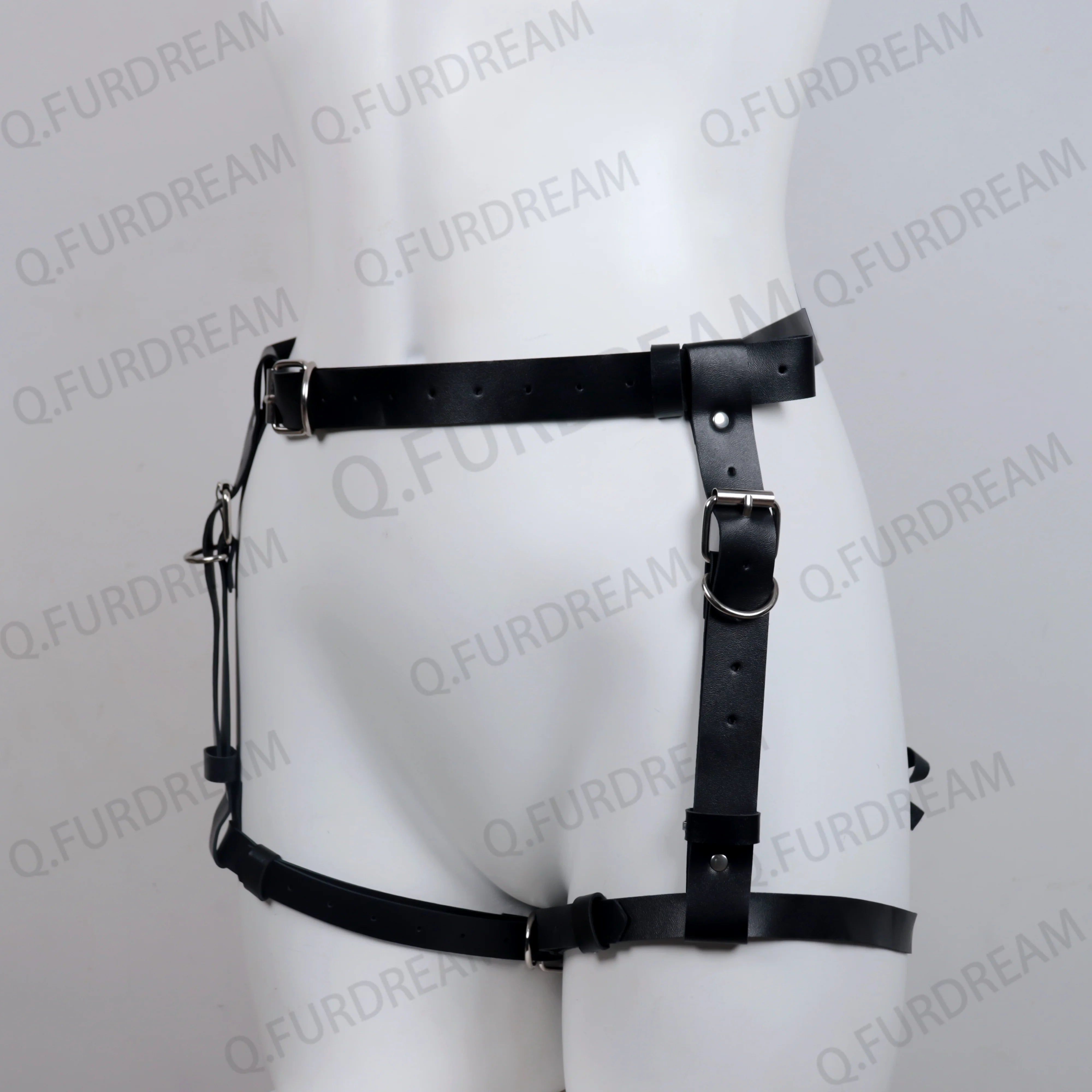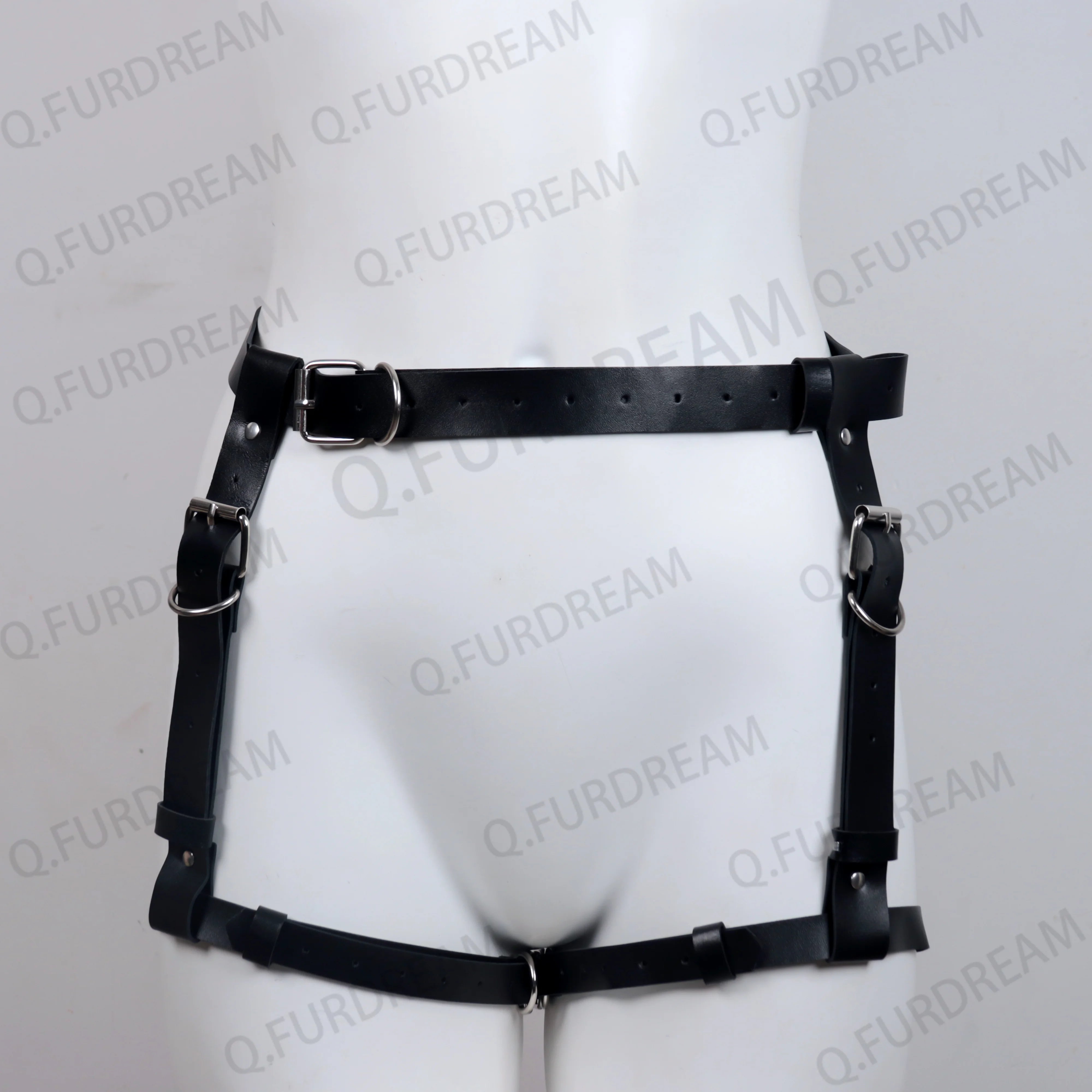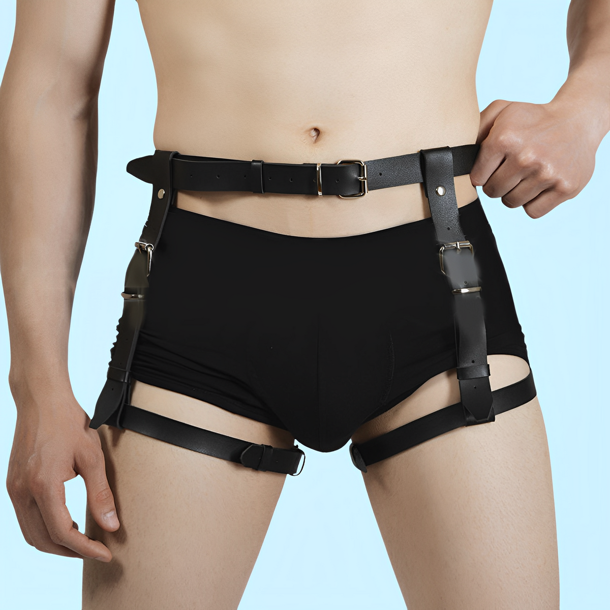 Belted twice. Hips set. Straps carve the legs. Hardware hits like a spark.