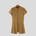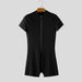 That deep V opens fast—metal pull, straight line, nothing to hide. Short sleeves hugging the arms. High-stretch, skin-tight fit that shows every shift of your chest and waist. One piece—top into mid-thigh shorts—so it stays put when the night gets rough around the edges.