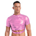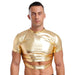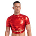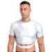 Metallic crop tee, fitted and high-shine. Short sleeves, crew neck, wet-look stretch that responds to movement and heat. The cutout exposes the midriff deliberately—the connected band underneath holds structure when the room compresses.
